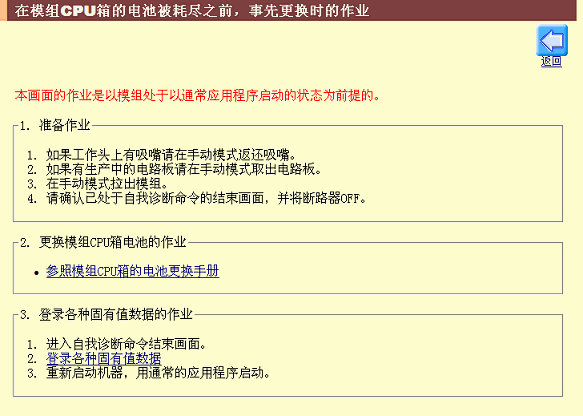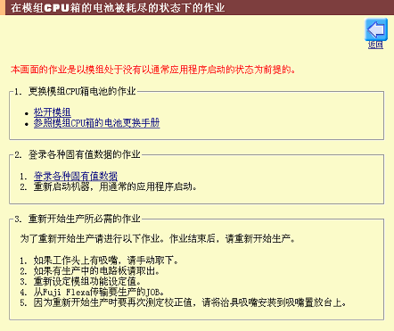 但是、如果由于电池已耗尽而造成模组处于不能以通常应用程序来启动的状态,必须进行前述14.2 如何在模组CPU箱的电池已耗尽的状态下进行更换作业,直到重新开始生产为止。