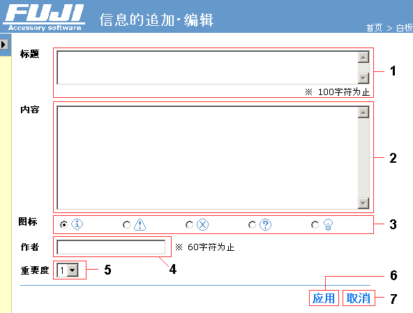 | 1 | 标题 | 信息的标题。在白板画面的信息一览中显示。必须加注标题,并在100字符以内记述。 |